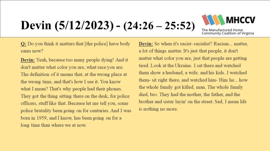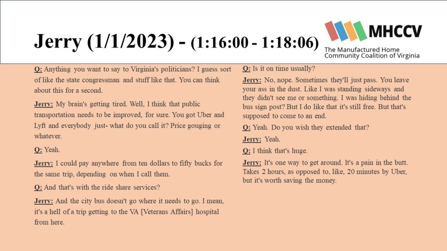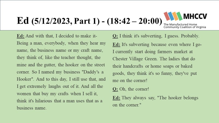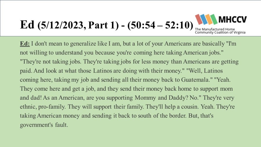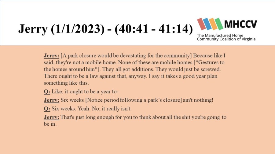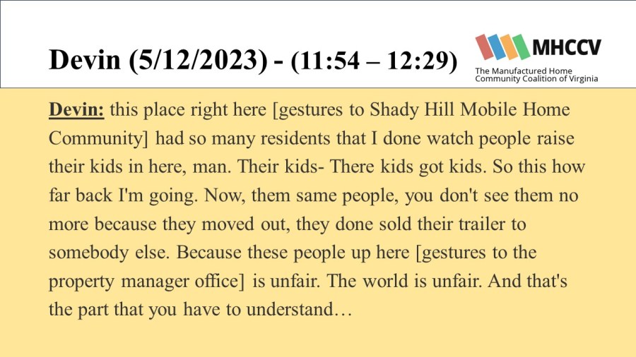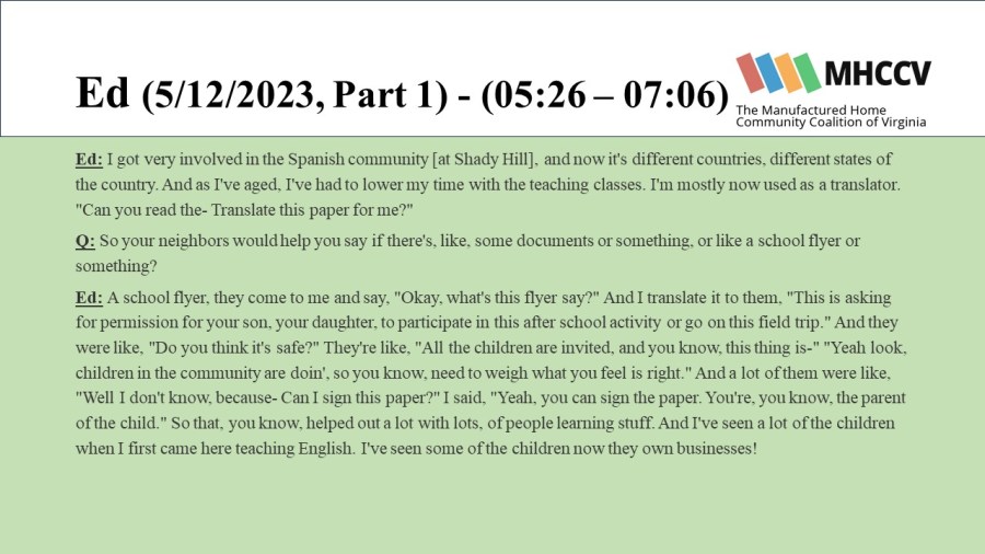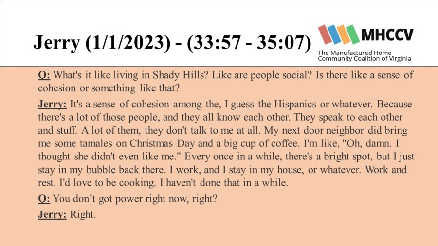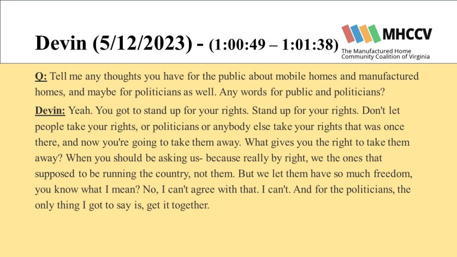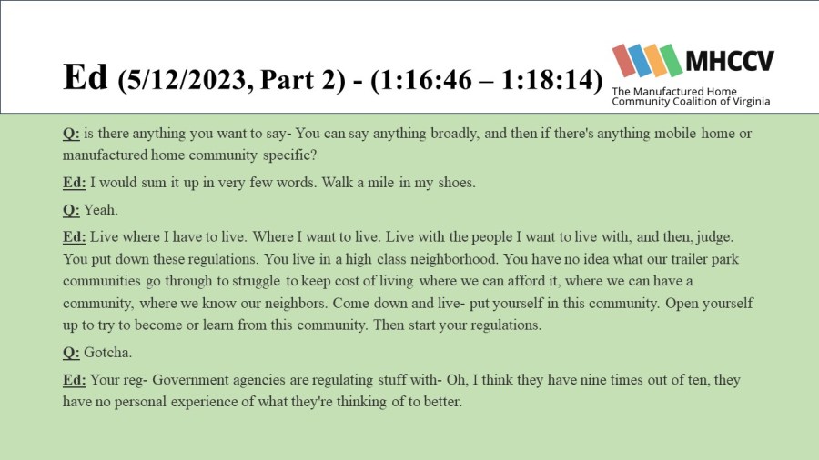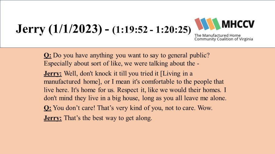 The following quotes are from manufactured home community residents who participated in our Resident Oral History Project. To learn more about the project, and listen to the full oral histories, click here: