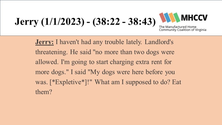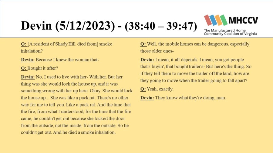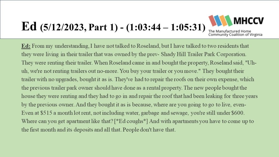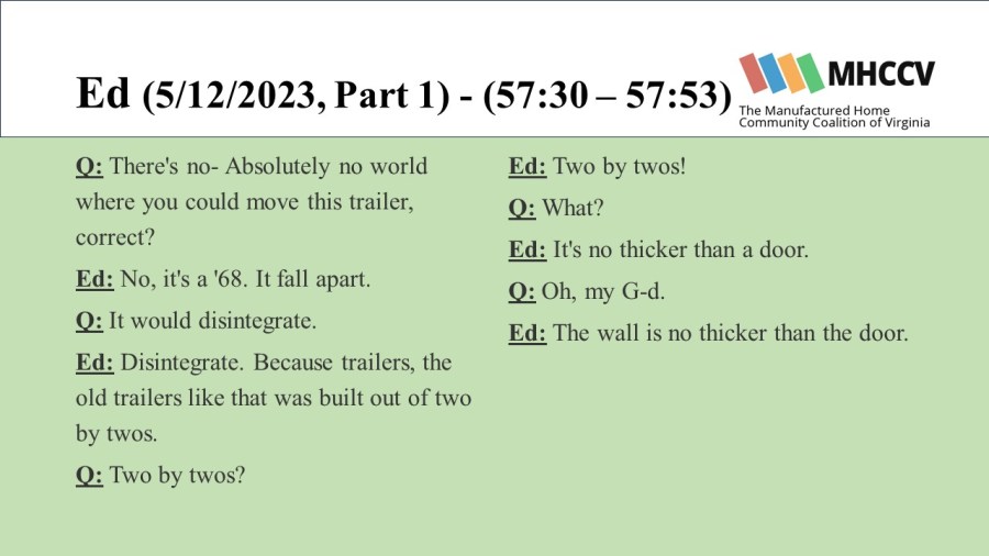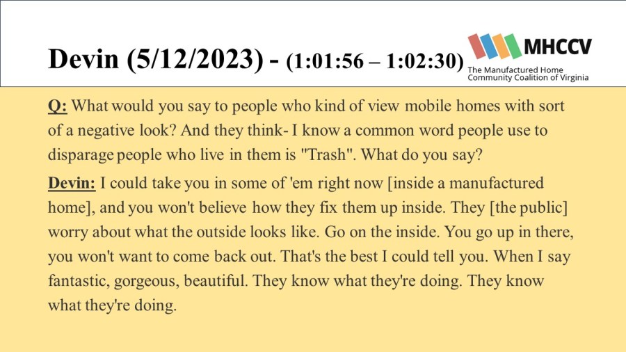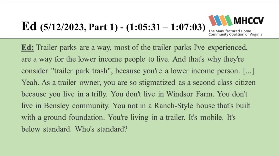 The Manufactured Home Community Coalition of Virginia (MHCCV) is a non-profit dedicated to improving the lives of those living in Virginia’s mobile (or manufactured) home communities.